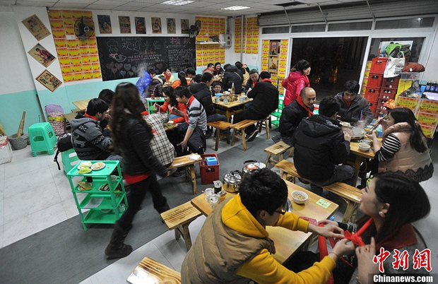 2月21日,重庆一家“80后的课堂”创意火锅店,很多市民前来感受品尝。“80后”小时候的课堂、玩具、动画片重现眼前。火锅店布置成了教室形式,柜台就是讲台,墙壁上的黑板上写着“校规”:只允许“80后”“上课”,点菜叫值日生,上菜叫上课,买单叫下课,进教室先考试,答案是菜品名字。“教室”里融合了很多“80后”的元素。会员卡是一本“学生证”,角落里放着一台电视机,和游戏卡片,上方格子里还放着不少玩具,墙壁四周还贴了不少奖状。浓厚的“80后”氛围吸引了不少的市民前来感受品尝。